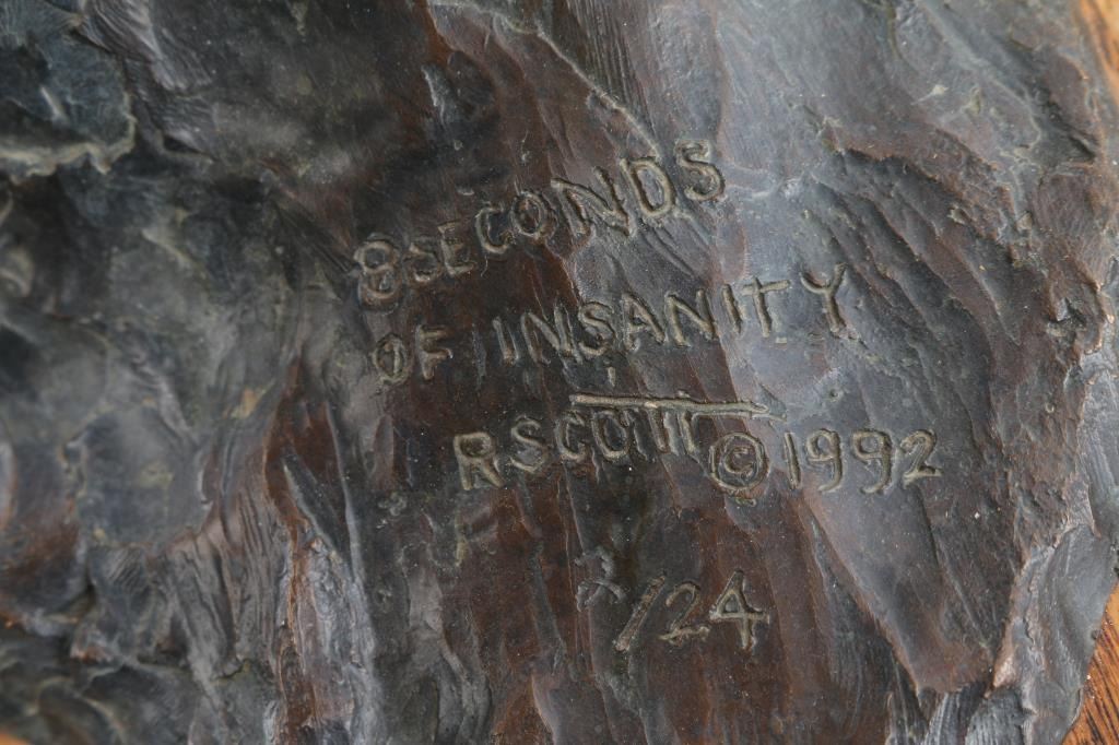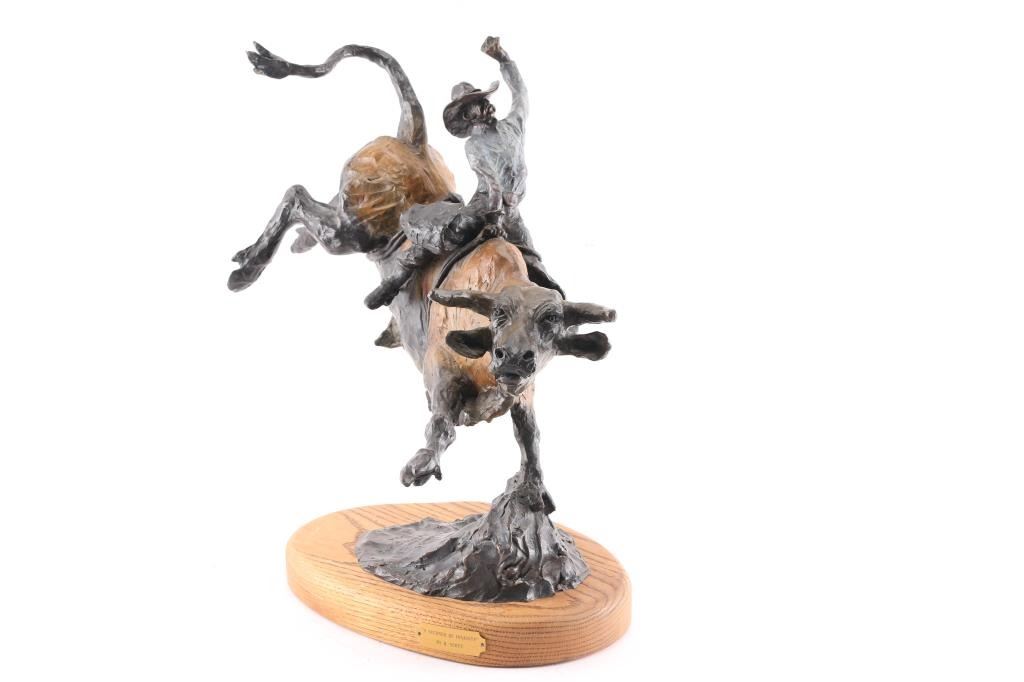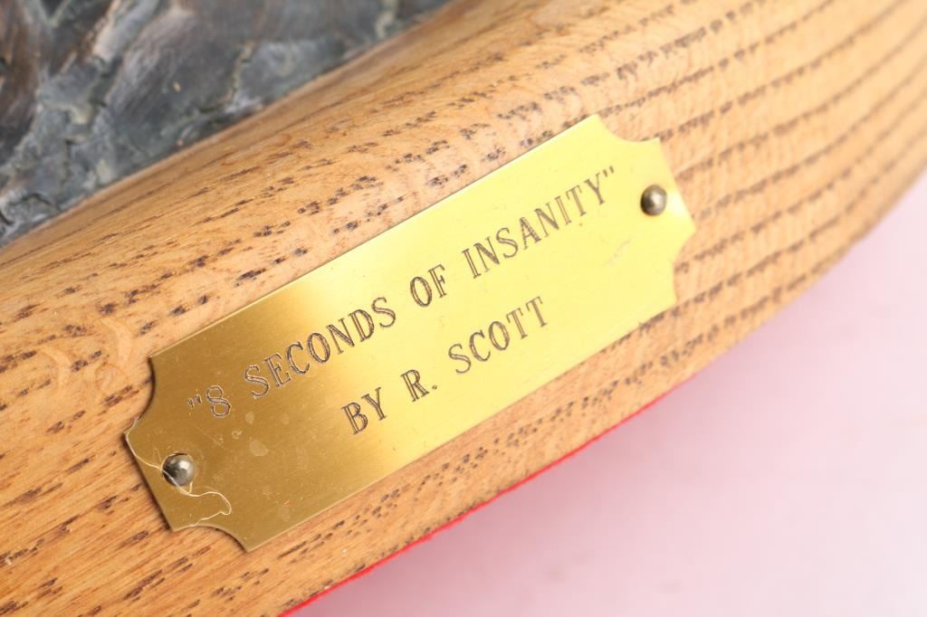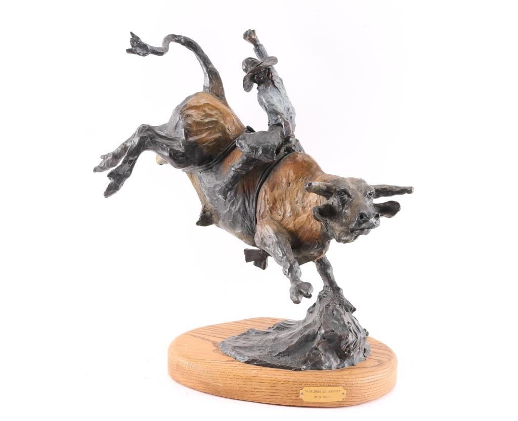By R. Scott. (1) Fine art bronze entitled "8 Seconds of Insanity". Colored bronze mounted on oak base. Depicts a cowboy riding a bull. One hand is in the air as the rider holds on with the other while the bull is bucking. #2 of 24. 1992. 21"H x 22"W x 10"D