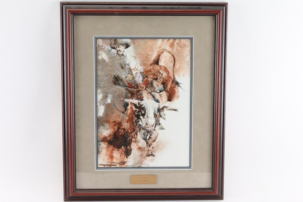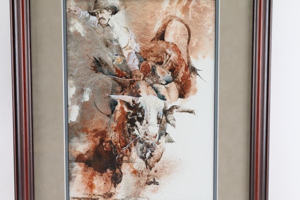 (1) Watercolor on paper entitled "8 Seconds of Insanity", signed center. Double matted and framed. Measures 14 1/2 x 10 1/2. R Scott (Roszel) (20th Century) was active/lived in United States. R Scott Roszel is known for Sculpture.