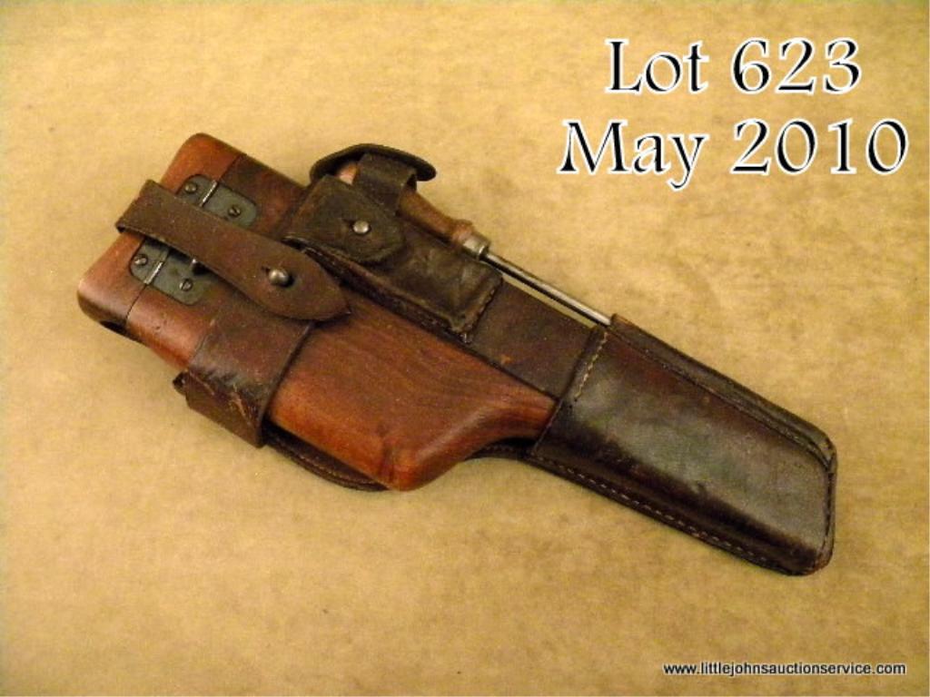 Original Broomhandle Mauser stock with lug #'d 159 with leather carrier and rod. Leather marked on rear with maker's name. 1917 and Bax 1117. Stock very good to near fine, leather good with wear to tip and stiching. Est. 350-700
