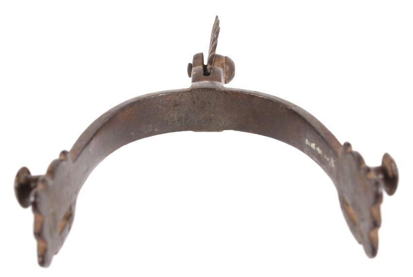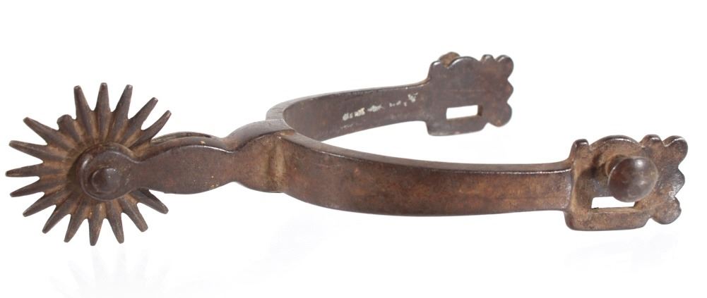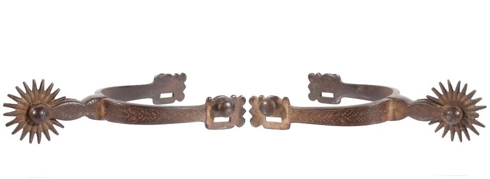 Offered in this lot we have a pair of original Buermann western iron cowboy spurs. The spurs show iron construction with engraved chasing along the outside edge. Each spur features a straight shank with the original 20 point rowels. The spurs show good condition overall with a warm patina across the piece and one of the rowels missing a tine. Each spur measures 6" long by 4" wide.