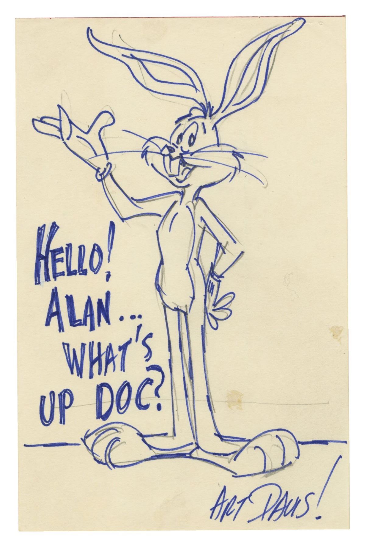 (Warner Bros, c.1980) An original drawing of Bugs Bunny created and signed by Animator/Director Arthur 'Art' Davis. Accomplished in blue ink over pencil on thin paper, the drawing is personalized "Hello! Alan... What's up Doc?" with Davis' signature in the bottom-right. The paper measures 8.5"x5.5" and the condition is fair to good with a few small spots of discoloration and a vertical fold mark from when this drawing was original mailed.