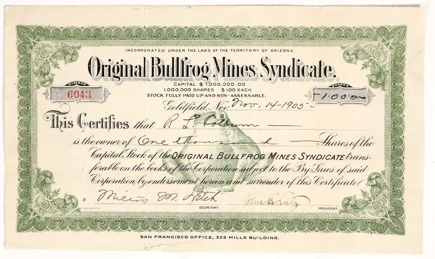Number 6043, issued for 1000 shares to RL Colburn in Goldfield on Nov. 14th, 1905. Signed by president John Lutz and secretary Hatch. Not cancelled. Green border, black print, and underprint green vignette of a bullfrog. Printed by Union Litho Co., SF. Across the bottom it reads San Francisco Office at 323 Mills Building. 5.5 x 9.5" Folds, pinholes, creases, archival tape repair. This mine was discovered by Shorty Harris and Cross in 1904. The mine was located on Bullfrog Mountain. They sold out soon after making the discovery. Cross old his share for $25,000. Harris got drunk and sold his for $500 and a mule. The mine continued to operate until the Panic of 1907 when it was forced to close. [Preserving the Glory Days by Hall]