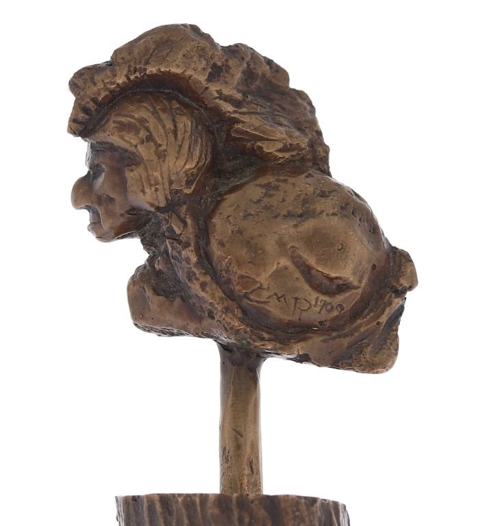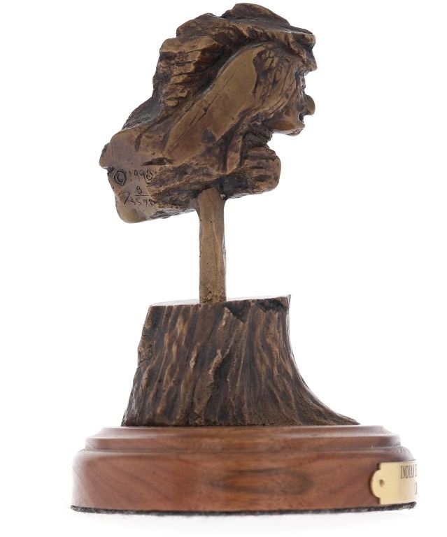 For your consideration is a Limited Edition Original Bronze Casting of Charles Russell's 1909 Soapstone carving, "Indian Head with Roach", #8 of 500. The original carving from Soapstone (Cowboy Jade), Whittled Twig (Stem), and Antler base, is the only known example of stone carving that Russell ever did, his signature and date are visible on the lower edge of the shield. Charles M. Russell, also known as C. M. Russell, Charlie Russell, and "Kid" Russell, was an American artist of the American Old West. He created more than 2,000 paintings of cowboys, Native Americans, and landscapes set in the western United States and in Alberta, Canada in addition to bronze sculptures, and was known as the "cowboy artist". Highly prized, his paintings have sold at auction in excess of $5.5 million and a bronze sold at auction for over $4 million.