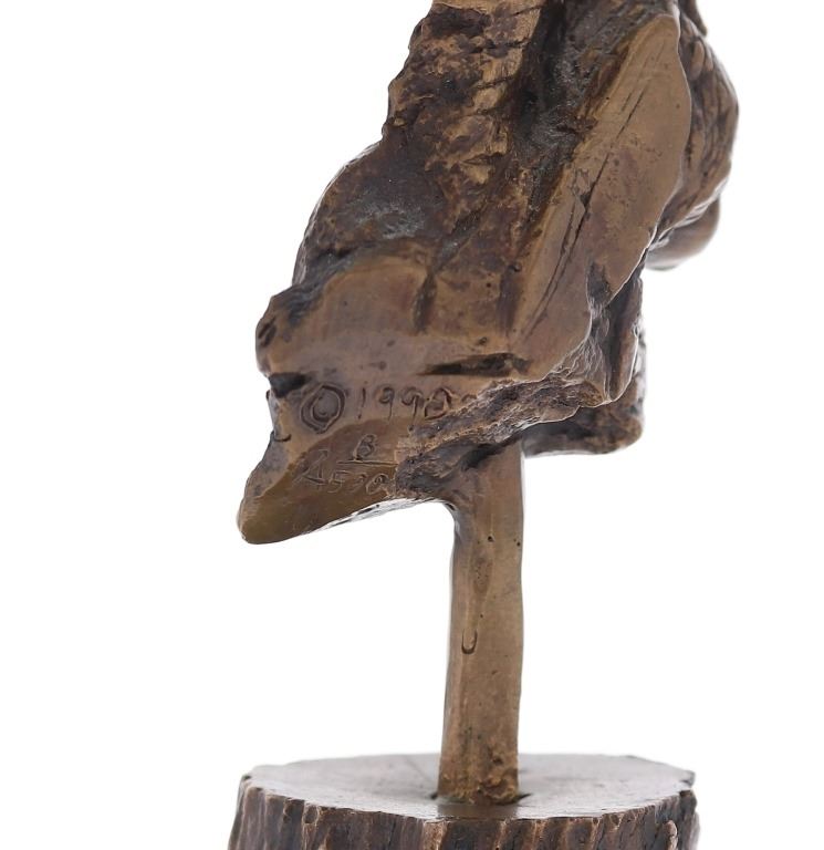 This bronze is in exceptional condition, is seated on a finished hardwood base, a metal name plate is affixed along the bottom edge of the base. No marring is noted to the bronze nor to the base. Approximate overall measurement is 4.75"H x 3.25" diameter