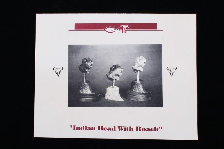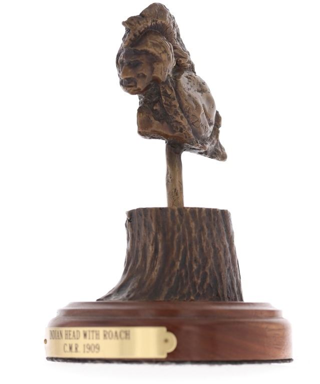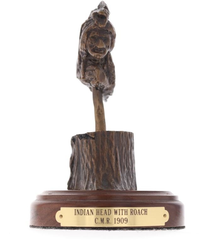 The lost wax-vacuum casting process utilized by Geffre's Foundry of Quincy, Washington - their stamp is noted on the opposite side of the Indian from Russell's signature along with the #8/500 for this limited edition - was used to pick up all the detail from the original carving and preserve it in bronze. At the time of the casting (1990), the original carving had been on display at the C. M. Russell Museum in Great Falls, Montana. This bronze depicts an Indian Head with a roach - a type of Mohawk hairstyle worn by some warriors of southern plains tribes such as the Pawnee. This is where their hair is shorn like a horse’s mane which was considered stylish in the 19th century. All their hair would be cut, save a strip down the middle of their head. In this bronze along with a roach, the warrior's hair is in braids with a feather in his hair and is carrying a shield with his hand in front.