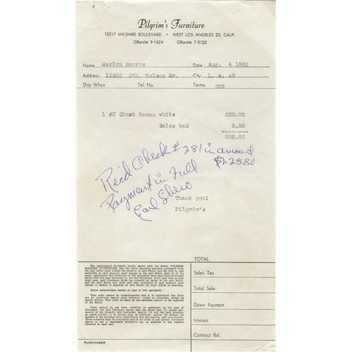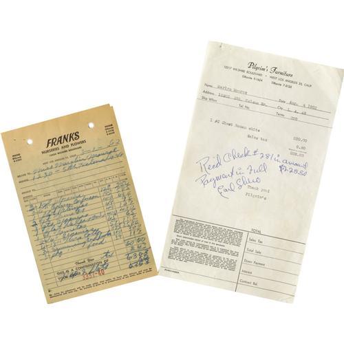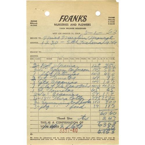 <B>Original Carbon Invoice and Bill for Marilyn Monroe.</B></I> Marilyn Monroe's death was ruled a "probable suicide" by Los Angles County Coroner Thomas Noguchi. Would someone who had just purchased flowers, flowerpots, and bird food for her garden and had furniture delivered literally hours before her death commit suicide? You decide! Offered are two items. First, the original carbon invoice from Frank's Nurseries and Flowers (ordered three days before her death). The partly printed carbon bill measures 5" x 7.75" and lists petunias, tomatoes, terra-cotta pots, hummingbird feeders, and hummingbird food. The carbon has staple holes and two files holes in the upper blank area. Next, a partly printed bill on Pilgrim's Furniture letterhead to Marilyn Monroe dated August 4, 1962. The bill measures 6" x 10.5" and is for "1 #C Chest Roman White" for $228.80, "COD," noted in ink "Rec'd check #281 in amount $228.80 Payment in Full Earl Shero." That evening, Marilyn retired to her bedroom at about 8:00 pm and was found dead in her bed eight hours later. The Pilgrim's Furniture bill has a small hole in the upper left corner. Both items are in fine condition. <I>Accompanied by a COA from John Reznikoff, PSA/DNA.</B></I><BR><BR><b>Shipping:</b> Flat Material, Small (<a target="_blank" href="http://www.heritageauctions.com/common/shipping.php">view shipping information</a>)
