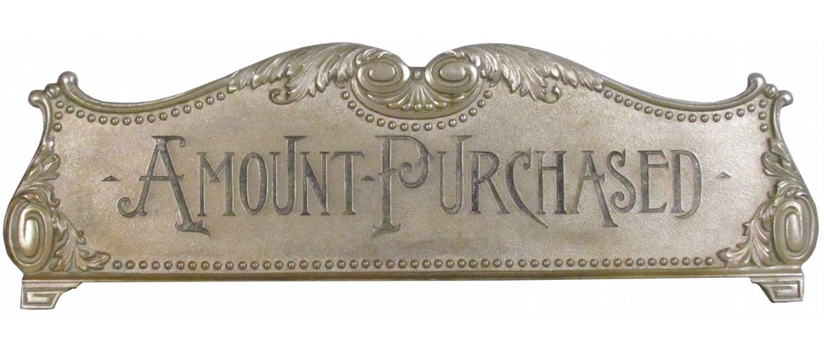 Original Cash Register Top Sign "Amount Purchased" with night and day clock on back. Not a reproduction. Distance between mounting holes is 14 1/2 inches.