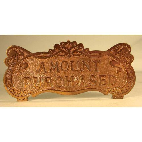 Original Cash Register Top Sign, brass, Amount Purchased. Overall 9 1/4 X 4 inches, distance from hole to hole 6 5/8 inches.