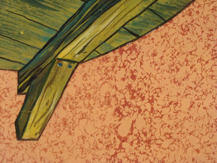 This original hand-painted background from the Nickelodeon TV show SpongeBob Squarepants. The story takes place under the deep blue sea in Bikini Bottom, where SpongeBob resides. SpongeBob, who is a yellow, porous sponge, is your typical happy-go-lucky character, as he is always cheerful and enjoys making people laugh. Patrick Star, SpongeBob's neighbor who is a starfish, is your average children's show idiot, as he boasts knowing nothing and is often getting himself into ridiculous situations. Between the homes of these two lies the home of the miserable Squidward, a squid, who is known for being grouchy and playing tricks on SpongeBob and Patrick. Both SpongeBob and Squidward work at the Krusty Krab, a fast food business run by the greedy money-loving Mr. Krabs, a crab, the arch rival of the evil, possibly misunderstood, Plankton. Another neighbor, Sandy Cheeks, an athletic squirrel who normally wears an astronaut's space suit, was introduced in "Tea at the Treedome." She spends most of her time inventing and experimenting. There appears to be the ceiling in the top left corner.Original Production Background Overall Size of Background: 10 1/4" x 14" Very good conditionOriginal Production Backgrounds are used in the making of the final version of animated productions. The background establishes the location and the overall good mood of the scenee. Typically, a background layout artist creates a drawing to establish the content of the scene, placement of characters, perspective and camera angle. Based on this drawing, the background artist creates a preliminary painting to confirm all of the scenes details, then the final production background which is used in the filming of the scene. When these backgrounds are individually photographed behind the progression of production cels, and projected at a rapid succession, the images in the foreground appear to move, creating an animated scene. The background is ready to be matted and framed. It is a colored background with the animator's notations at the bottom. The wooden ceiling has been glued onto the background