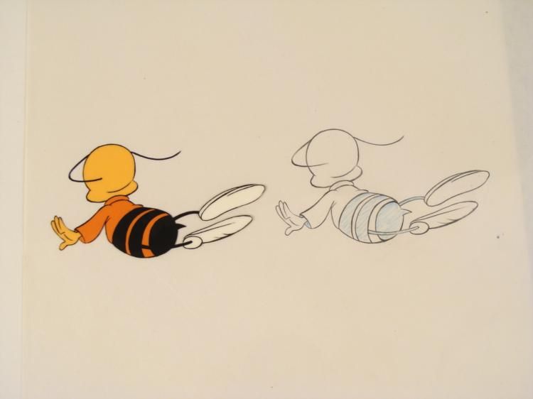 Here is that cute little Honey Nut bee named Buzz. This is an original animation cel & drawing from the production of the Cheerios cereal commercial. * Medium: Hand painted acetate cel with drawing * Cel size: 10 1/2 x 12 1/2 inchesDrawing size: 10 1/2 x 12 1/2 inches * Details: Number and peg holes at the bottom edgeCondition: Very goodPencil color: non-photo blue and black *