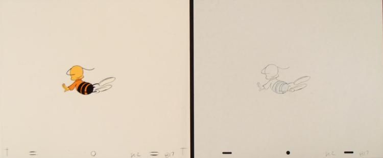 Here is that cute little Honey Nut bee named Buzz. This is an original animation cel & drawing from the production of the Cheerios cereal commercial.Medium: Hand painted acetate cel with drawingCel size: 10 1/2 x 12 1/2 inchesDrawing size: 10 1/2 x 12