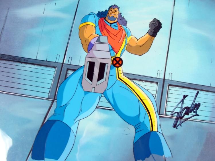 This is an original signed production cel and background from the hit series X-Men. Stan Lee signature is located on the bottom of cel in black sharpie. * * Under a cloud of increasing anti-mutant sentiment, Professor Xavier creates a haven at his Westchester mansion to train young mutants to use their powers for the benefit of humanity, and to prove mutants can be heroes. Xavier recruited Cyclops, Iceman, Angel, * Beast and Jean Grey calling them "X-Men" because they possessed the "x-gene", an ability normal humans lacked. Early issues introduced the team's arch enemy, Magneto and his Brotherhood of Evil Mutants, who would later battle the X-Men for years. * * Now what?? Look who has the bigger gun!!! * * * * * Original Animated Cel and Printed Background * * Overall Size of Background: 10" x 14 1/4" Overall Size of the Cel: 10 1/2" x 12 1/2" Excellent Condition * * * This is an original hand-painted cel set-up used in the production of an episode of "X-MEN." Each one-of-a-kind set-up represents a slight change in position of the characters. When individually photographed and projected in rapid succession, the images * appear to move. * * To create production cels, the original animator's drawing is transferred onto an acetate cel (by hand-inking and/or photo copying). The cel is then hand-painted on the reverse side. The background accompanying this set-up is a reproduction background. * * * The background and cel are ready to be matted and framed. It is a colored background with a cel and has the animator's notations at the bottom of both. * * * * *