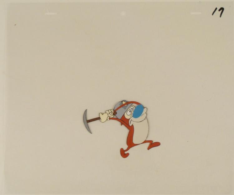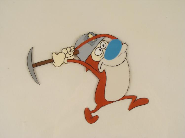 This is an original production animation cel from the Nickelodeon TV show Ren & Stimpy. The show follows two characters - Ren, a crazy Chihuahua - and - Stimpy, an incredibly stupid cat - as they think up to all kinds of hair brained schemes and get themselves into some sticky situations. The Ren and Stimpy Show debuted in August 1991 with a two-part episode, 'Stimpy's Big Day / The Big Shot' and became an instant hit. It was the third Nicktoon ever to be aired on the Network alongside Doug and Rugrats . * Stimpy is holding a pickaxe * Original Production Art Cel Overall Size of the Cel: 10 1/2" x 1/2" Very Good condition This is an original hand-painted cel set-up used in the production of an episode of "The Ren & Stimpy Show." Each one-of-a-kind set-up represents a slight change in position of the characters. When individually photographed and projected in rapid succession, the images appear to move. * To create production cels, the original animator's drawing is transferred onto an acetate cel (by hand-inking and/or photo copying). The cel is then hand-painted on the reverse side. * The cel is ready to be matted and framed. The animator's notations are shown at the bottom of the cel. The cel has some slight paint fade to Stimpy's outline. *