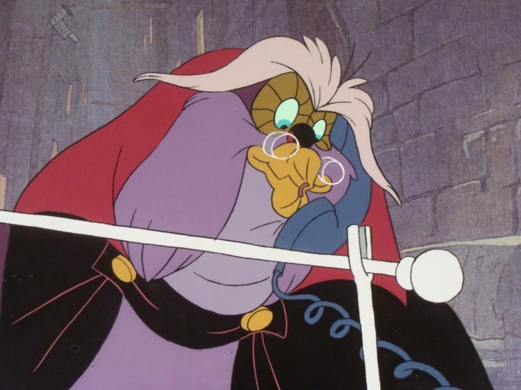This is an original animation cel used in the production of the 1991 Don Bluth film Rock-A-Doodle. Grand Duke of Owls looks like he is making his final plans in stopping Chanticleer. * * Medium: Hand painted cel acetate with printed background Size of cel: 13 1/2 x 16 1/2 inchesSize of background: 11 x 17 inches * Details: Animator notations along the left side of cel and on top of the background * Condition: Very Good; there is some paper and paint residue near the top of the cel * *