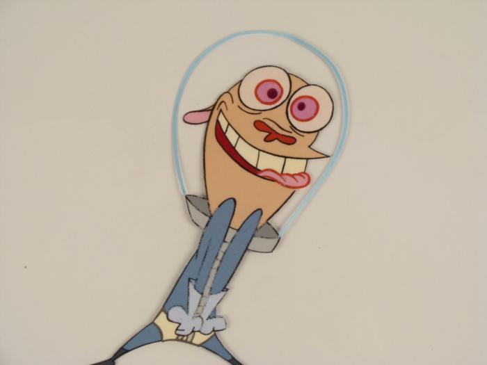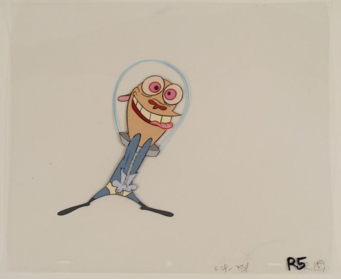 This is an original production animation cel from the Nickelodeon TV show Ren & Stimpy. The show follows two characters - Ren, a crazy Chihuahua - and - Stimpy, an incredibly stupid cat - as they think up to all kinds of hair brained schemes and get themselves into some sticky situations. The Ren and Stimpy Show debuted in August 1991 with a two-part episode, 'Stimpy's Big Day / The Big Shot' and became an instant hit. It was the third Nicktoon ever to be aired on the Network alongside Doug and Rugrats. Ecstatic Ren is in a spacesuit.Original Production Art Cel Overall Size of the Cel: 10 1/2" x 12 1/2" Very Good condition This is an original hand-painted cel set-up used in the production of an episode of "The Ren & Stimpy Show." Each one-of-a-kind set-up represents a slight change in position of the characters. When individually photographed and projected in rapid succession, the images appear to move.
