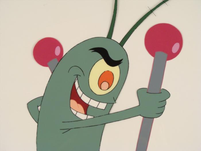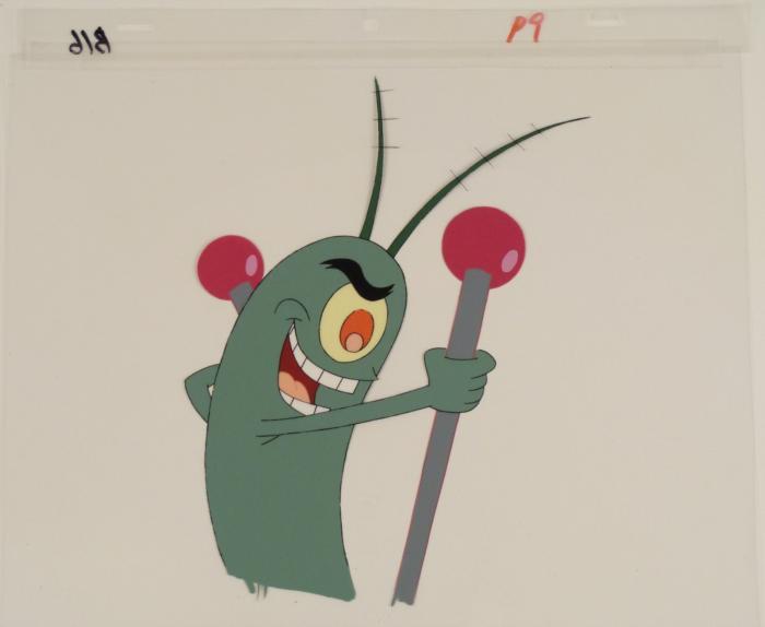 This original animation cel is from the Nickelodeon TV show SpongeBob Squarepants. The story takes place under the deep blue sea in Bikini Bottom, where SpongeBob resides. SpongeBob, who is a yellow, porous sponge, is your typical happy-go-lucky character, as he is always cheerful and enjoys making people laugh. Patrick Star, SpongeBob's neighbor who is a starfish, is your average children's show idiot, as he boasts knowing nothing and is often getting himself into ridiculous situations. Between the homes of these two lies the home of the miserable Squidward, a squid, who is known for being grouchy and playing tricks on SpongeBob and Patrick. Both SpongeBob and Squidward work at the Krusty Krab, a fast food business run by the greedy money-loving Mr. Krabs, a crab, the arch rival of the evil, possibly misunderstood, Plankton. Another neighbor, Sandy Cheeks, an athletic squirrel who normally wears an astronaut's space suit, was introduced in "Tea at the Treedome." She spends most of her time inventing and experimenting. It appears that Plankton has total control over Spongebob.Original Production Animated Cel Overall Size of Cel: 10 1/2" x 12 1/2" Excellent ConditionThis is an original hand-painted cel set-up used in the production of an episode of "SpongeBob SquarePants." Each one-of-a-kind set-up represents a slight change in position of the characters. When individually photographed and projected in rapid succession, the images appear to move.