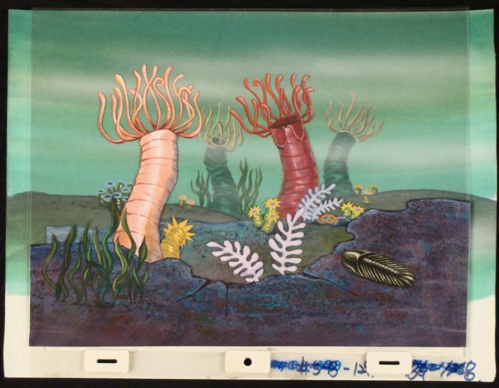 To create production cels, the original animator's drawing is transferred onto an acetate cel (by hand-inking and/or photo copying). The cel is then hand-painted on the reverse side. The background accompanying this set-up is a hand-painted original production background. The background is ready to be matted and framed. It is a colored background with a cel and has the animator's notations at the bottom of the background. The cel is multilayered: first are plants chilling on a rock bed and next are plants coming out of the ground. Both cels have painted paper cut-outs glued to the cel.