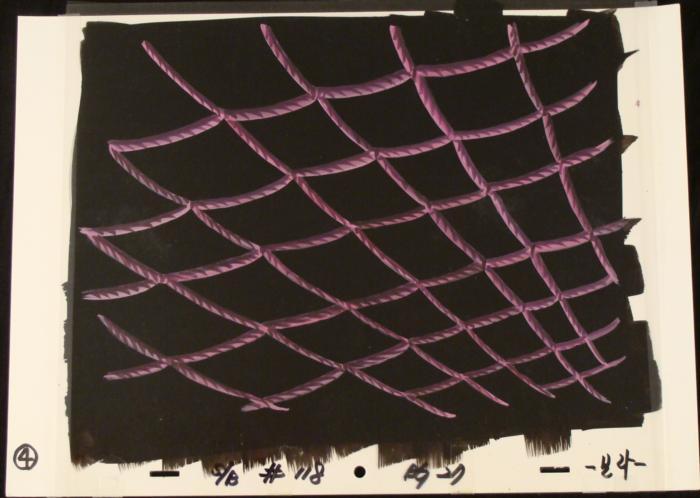 To create production cels, the original animator's drawing is transferred onto an acetate cel (by hand-inking and/or photo copying). The cel is then hand-painted on the reverse side. The background accompanying this set-up is a hand-painted original production background. The background is ready to be matted and framed. It is a colored background with a cel and has the animator's notations at the bottom of the background and the cel. There is a protective over layer to the cel under it. The first cel has nothing on it.