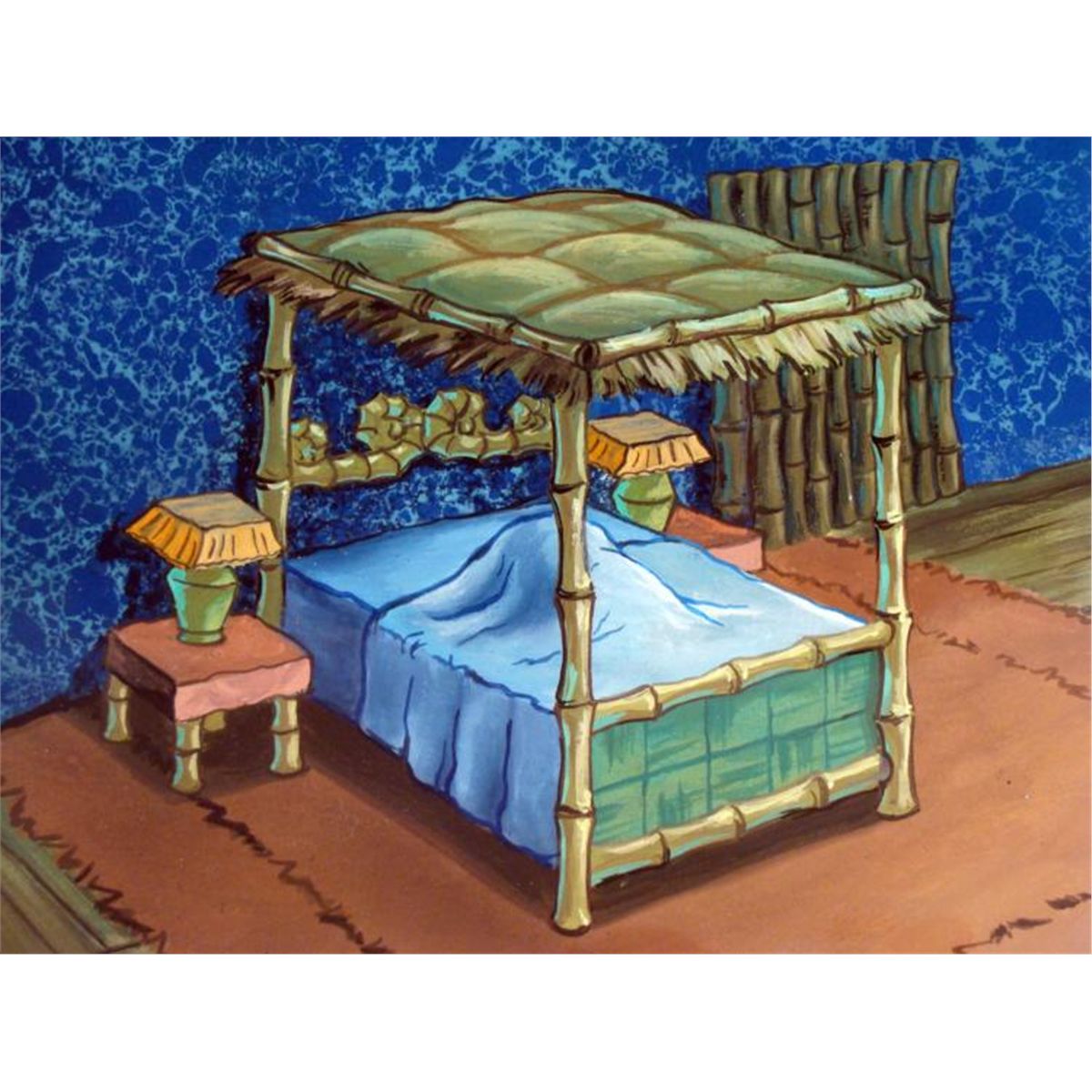 This original animation cel with original background is from the Nickelodeon TV show SpongeBob Squarepants. The story takes place under the deep blue sea in Bikini Bottom, where SpongeBob resides. SpongeBob, who is a yellow, porous sponge, is your typical happy-go-lucky character, as he is always cheerful and enjoys making people laugh. Patrick Star, SpongeBob's neighbor who is a starfish, boasts knowing nothing and is often getting himself into ridiculous situations. Between the homes of these two lies the home of the miserable Squidward, a squid, who is known for being grouchy and playing tricks on SpongeBob and Patrick. Both SpongeBob and Squidward work at the Krusty Krab, a fast food business run by the greedy money-loving Mr. Krabs, a crab, the arch rival of the evil, possibly misunderstood, Plankton. Another neighbor, Sandy Cheeks, an athletic squirrel who normally wears an astronaut's space suit, was introduced in "Tea at the Treedome." She spends most of her time inventing and experimenting. * SpongBob's bedroom looks peaceful except for that hole blast into the side of the wall! * Original Production Background and Animated Cel Overall Size of Background: 10 1/2" x 14" Overall Size of the Cel: 10 1/2" x 13" Very good condition; it has been rolledThis is an original hand-painted cel set-up used in the production of an episode of "SpongeBob SquarePants." Each one-of-a-kind set-up represents a slight change in position of the characters. When individually photographed and projected in rapid succession, the images appear to move. * To create production cels, the original animator's drawing is transferred onto an acetate cel (by hand-inking and/or photo copying). The cel is then hand-painted on the reverse side. The background accompanying this set-up is a hand-painted original production background. * The animator's notations at the bottom of the background and cel. *