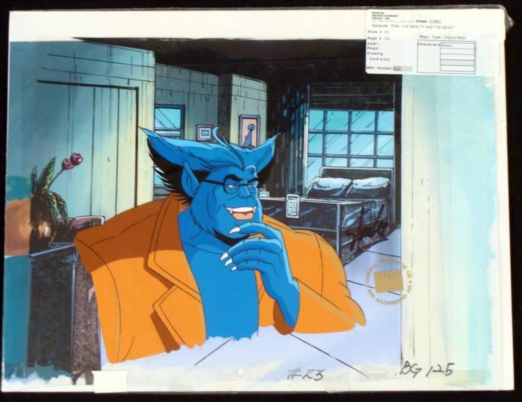 This is an original signed production cel and background from the hit series X-Men. Stan Lee signature is located on the right of cel in black sharpie. * Under a cloud of increasing anti-mutant sentiment, Professor Xavier creates a haven at his Westchester mansion to train young mutants to use their powers for the benefit of humanity, and to prove mutants can be heroes. Xavier recruited Cyclops, Iceman, Angel, Beast and Jean Grey calling them "X-Men" because they possessed the "x-gene", an ability normal humans lacked. Early issues introduced the team's arch enemy, Magneto and his Brotherhood of Evil Mutants, who would later battle the X-Men for years. * Beast is a very intelligent mutant * * Original Animated Cel & Production BackgroundMedium: Hand painted acetate celDetails: Animation notations and peg holes * Overall Size of the Cel: 10 1/2" x 12 1/2" Overall Size of the background: 10 1/4" x 14 1/2" Excellent Condition This is an original hand-painted cel set-up used in the production of an episode of X-Men titled "Beauty and the Beast." Each one-of-a-kind set-up represents a slight change in position of the characters. When individually photographed and projected in rapid succession, the images appear to move. * To create production cels, the original animator's drawing is transferred onto an acetate cel (by hand-inking and/or photo copying). The cel is then hand-painted on the reverse side. The background accompanying this set-up is an original production background. * The cel and original background is ready to be matted and framed. The animators notations are located at the bottom of the cel and background. . A Certificate of Authenticity from Marvel is on the back of background. The Marvel Seal is located at the top right of the cel. The cel and background are in a protective sleeve. An information card about the episode is located at the top right of the protective sleeve. *