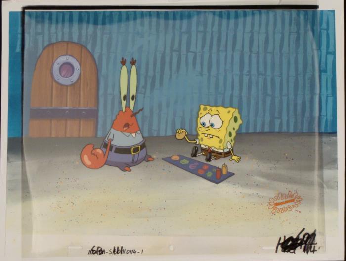 To create production cels, the original animator's drawing is transferred onto an acetate cel (by hand-inking and/or photo copying). The cel is then hand-painted on the reverse side. The background accompanying this set-up is a reproduction background. The printed background is ready to be matted and framed. The notations are located at the bottom of both. The cel is multi-layered: first is Spongebob's eyes, then is body, and next is the Mr. Krabs. There is some paint fade to Spongebob's eyes, outline, and Mr. Krabs outline. There are two small rips near the top of the background.