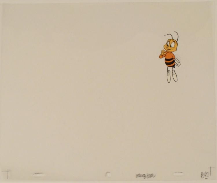 Here, it appears that Buzz is chillin. This is an original animation cel from the production of the Cheerios cereal commercial. * Medium: Hand painted acetate celCel size: 10 1/2 x 12 1/2 inchesDetails: Number and peg holes at the bottom edgeCondition: Very good; some paint fade to outline *