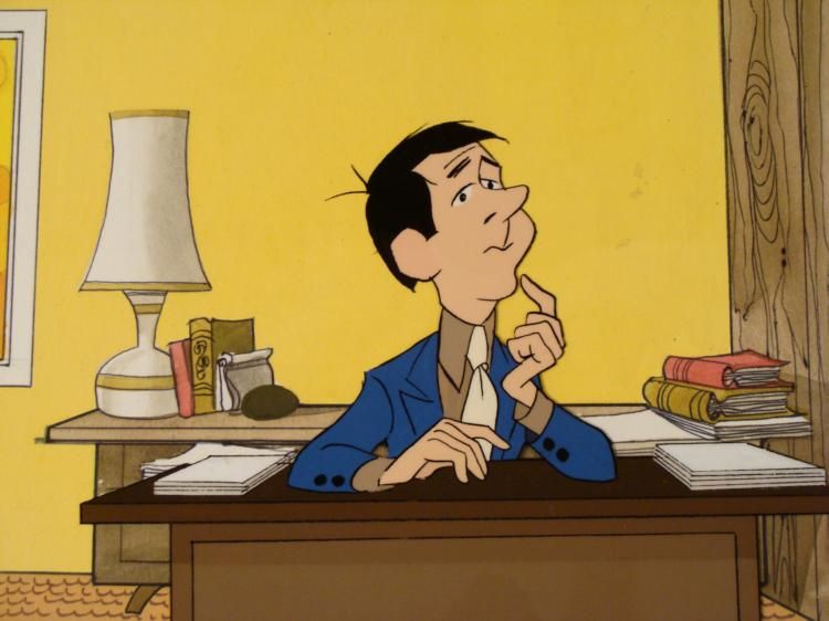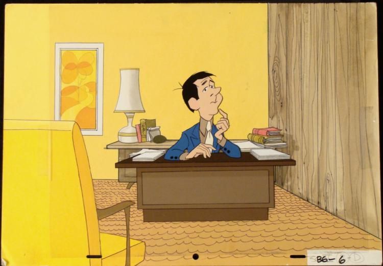 Here is a man sitting at his desk who is apparently is thinking long and hard about something. We are not sure what show this cel is from. * * * Original Production Background and Animated Cel * Overall Size of Background: 10 1/2" x 15" Overall Size of the Cel: 10 1/2" x 12 1/2" Very good condition * This is an original hand-painted cel set-up was used in the production of a television show or movie. Each one-of-a-kind set-up represents a slight change in position of the characters. When individually photographed and projected in rapid succession, the * images appear to move. * * To create production cels, the original animator's drawing is transferred onto an acetate cel (by hand-inking and/or photo copying). The cel is then hand-painted on the reverse side. The background accompanying this set-up is a hand-painted original production * background. * * The background and cel are ready to be matted and framed. It is a colored background with a cel and has the animator's notations at the bottom of the background and cel. There is some smudges and the left corner of the background has been creased. * * *