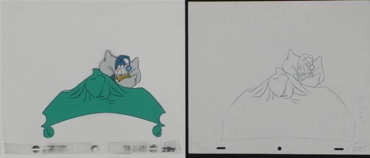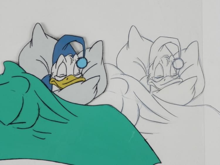 Here, it appears Donald Duck has his head in the pillow. This is an original animation cel from the production of Disney shows * Medium: Hand painted acetate cel with drawing * Size of cel: 10 1/2 x 12 1/2 inchesSize of drawing: 10 1/2 x 12 1/2 inches * Condition: Very goodDetails: Numbered on bottom rightDrawing Color: Blue and gray pencilThe cel received may be ever so slightly different than the one shown in the auction photo. * *