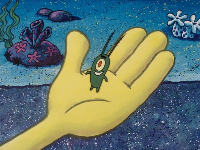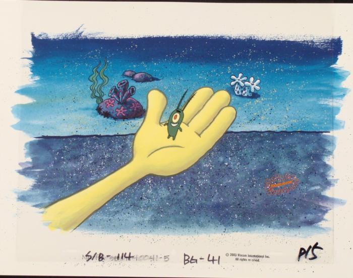This animation cel and reproduction background are from the Nickelodeon TV show SpongeBob Squarepants. The story takes place under the deep blue sea in Bikini Bottom, where SpongeBob resides. SpongeBob, who is a yellow, porous sponge, is your typical happy-go-lucky character, as he is always cheerful and enjoys making people laugh. Patrick Star, SpongeBob's neighbor who is a starfish, is your average children's show idiot, as he boasts knowing nothing and is often getting himself into ridiculous situations. Between the homes of these two lies the home of the miserable Squidward, a squid, who is known for being grouchy and playing tricks on SpongeBob and Patrick. Both SpongeBob and Squidward work at the Krusty Krab, a fast food business run by the greedy money-loving Mr. Krabs, a crab, the arch rival of the evil, possibly misunderstood, Plankton. Another neighbor, Sandy Cheeks, an athletic squirrel who normally wears an astronaut's space suit, was introduced in "Tea at the Treedome." She spends most of her time inventing and experimenting. Plankton is in SpongeBob's handOriginal Printed Background and Animated Cel Overall Size of Background: 11" x 17" Overall Size of the Cel: 10 1/2" x 12 1/2" Very good condition This is an original hand-painted cel set-up used in the production of an episode of "SpongeBob SquarePants." Each one-of-a-kind set-up represents a slight change in position of the characters. When individually photographed and projected in rapid succession, the images appear to move.