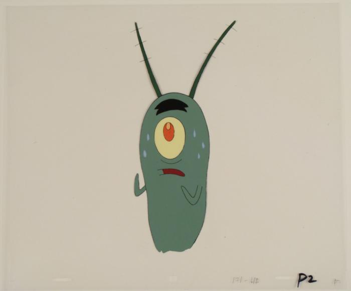 This original animation cel is from the Nickelodeon TV show SpongeBob Squarepants. The story takes place under the deep blue sea in Bikini Bottom, where SpongeBob resides. SpongeBob, who is a yellow, porous sponge, is your typical happy-go-lucky character, as he is always cheerful and enjoys making people laugh. Patrick Star, SpongeBob's neighbor who is a starfish, is your average children's show idiot, as he boasts knowing nothing and is often getting himself into ridiculous situations. Between the homes of these two lies the home of the miserable Squidward, a squid, who is known for being grouchy and playing tricks on SpongeBob and Patrick. Both SpongeBob and Squidward work at the Krusty Krab, a fast food business run by the greedy money-loving Mr. Krabs, a crab, the arch rival of the evil, possibly misunderstood, Plankton. Another neighbor, Sandy Cheeks, an athletic squirrel who normally wears an astronaut's space suit, was introduced in "Tea at the Treedome." She spends most of her time inventing and experimenting. Has Plankton's maniacal plotting and scheme finally about to end? Original Production Animated Cel Overall Size of Cel: 10 1/2" x 12 1/2" Excellent ConditionThis is an original hand-painted cel set-up used in the production of an episode of "SpongeBob SquarePants." Each one-of-a-kind set-up represents a slight change in position of the characters. When individually photographed and projected in rapid succession, the images appear to move.