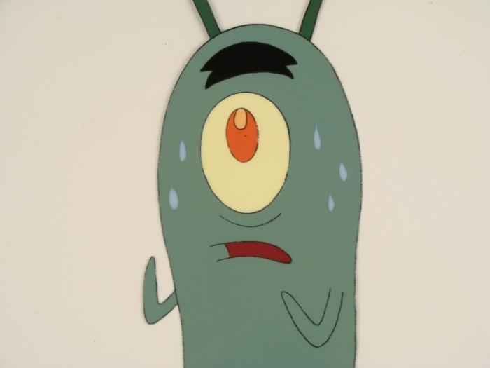 This original animation cel is from the Nickelodeon TV show SpongeBob Squarepants. The story takes place under the deep blue sea in Bikini Bottom, where SpongeBob resides. SpongeBob, who is a yellow, porous sponge, is your typical happy-go-lucky character, as he is always cheerful and enjoys making people laugh. Patrick Star, SpongeBob's neighbor who is a starfish, is your average children's show idiot, as he boasts knowing nothing and is often getting himself into ridiculous situations. Between the homes of these two lies the home of the miserable Squidward, a squid, who is known for being grouchy and playing tricks on SpongeBob and Patrick. Both SpongeBob and Squidward work at the Krusty Krab, a fast food business run by the greedy money-loving Mr. Krabs, a crab, the arch rival of the evil, possibly misunderstood, Plankton. Another neighbor, Sandy Cheeks, an athletic squirrel who normally wears an astronaut's space suit, was introduced in "Tea at the Treedome." She spends most of her time inventing and experimenting. Has Plankton's maniacal plotting and scheme finally about to end? Original Production Animated Cel Overall Size of Cel: 10 1/2" x 12 1/2" Excellent ConditionThis is an original hand-painted cel set-up used in the production of an episode of "SpongeBob SquarePants." Each one-of-a-kind set-up represents a slight change in position of the characters. When individually photographed and projected in rapid succession, the images appear to move.