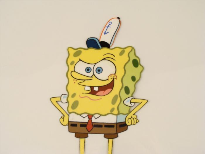 This original animation cel is from the Nickelodeon TV show SpongeBob Squarepants. The story takes place under the deep blue sea in Bikini Bottom, where SpongeBob resides. SpongeBob, who is a yellow, porous sponge, is your typical happy-go-lucky character, as he is always cheerful and enjoys making people laugh. Patrick Star, SpongeBob's neighbor who is a starfish, is your average children's show idiot, as he boasts knowing nothing and is often getting himself into ridiculous situations. Between the homes of these two lies the home of the miserable Squidward, a squid, who is known for being grouchy and playing tricks on SpongeBob and Patrick. Both SpongeBob and Squidward work at the Krusty Krab, a fast food business run by the greedy money-loving Mr. Krabs, a crab, the arch rival of the evil, possibly misunderstood, Plankton. Another neighbor, Sandy Cheeks, an athletic squirrel who normally wears an astronaut's space suit, was introduced in "Tea at the Treedome." She spends most of her time inventing and experimenting. SpongeBob has a malicious smile.Original Production Animated Cel Overall Size of Cel: 10 1/2" x 12 1/2" Very Good ConditionThis is an original hand-painted cel set-up used in the production of an episode of "SpongeBob SquarePants." Each one-of-a-kind set-up represents a slight change in position of the characters. When individually photographed and projected in rapid succession, the images appear to move.