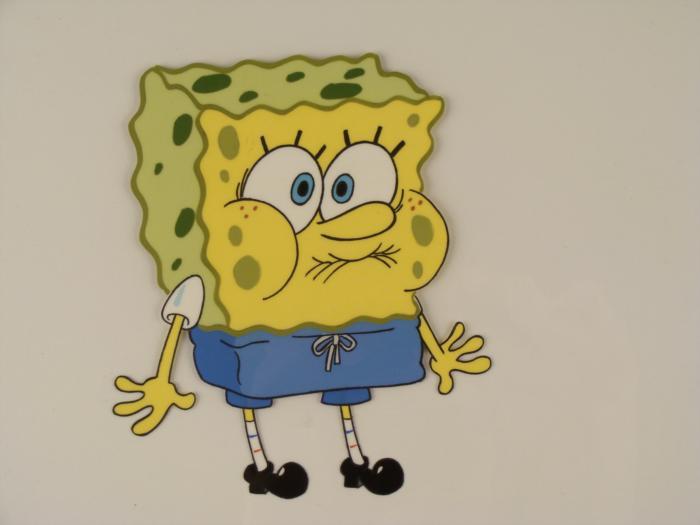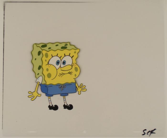 This original animation cel is from the Nickelodeon TV show SpongeBob Squarepants. The story takes place under the deep blue sea in Bikini Bottom, where SpongeBob resides. SpongeBob, who is a yellow, porous sponge, is your typical happy-go-lucky character, as he is always cheerful and enjoys making people laugh. Patrick Star, SpongeBob's neighbor who is a starfish, is your average children's show idiot, as he boasts knowing nothing and is often getting himself into ridiculous situations. Between the homes of these two lies the home of the miserable Squidward, a squid, who is known for being grouchy and playing tricks on SpongeBob and Patrick. Both SpongeBob and Squidward work at the Krusty Krab, a fast food business run by the greedy money-loving Mr. Krabs, a crab, the arch rival of the evil, possibly misunderstood, Plankton. Another neighbor, Sandy Cheeks, an athletic squirrel who normally wears an astronaut's space suit, was introduced in "Tea at the Treedome." She spends most of her time inventing and experimenting. Get Spongebob some oxygen, stat!Original Production Animated Cel Overall Size of Cel: 10 1/2" x 12 1/2" Excellent ConditionThis is an original hand-painted cel set-up used in the production of an episode of "SpongeBob SquarePants." Each one-of-a-kind set-up represents a slight change in position of the characters. When individually photographed and projected in rapid succession, the images appear to move.