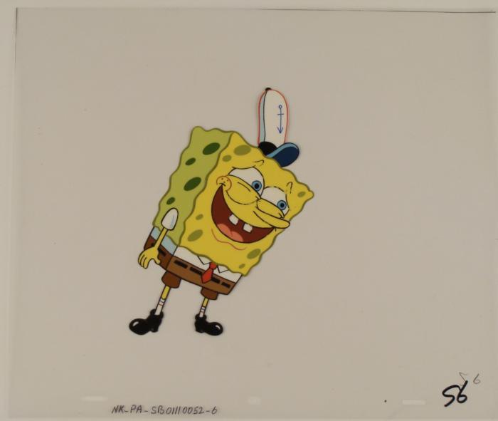 This original animation cel is from the Nickelodeon TV show SpongeBob Squarepants. The story takes place under the deep blue sea in Bikini Bottom, where SpongeBob resides. SpongeBob, who is a yellow, porous sponge, is your typical happy-go-lucky character, as he is always cheerful and enjoys making people laugh. Patrick Star, SpongeBob's neighbor who is a starfish, is your average children's show idiot, as he boasts knowing nothing and is often getting himself into ridiculous situations. Between the homes of these two lies the home of the miserable Squidward, a squid, who is known for being grouchy and playing tricks on SpongeBob and Patrick. Both SpongeBob and Squidward work at the Krusty Krab, a fast food business run by the greedy money-loving Mr. Krabs, a crab, the arch rival of the evil, possibly misunderstood, Plankton. Another neighbor, Sandy Cheeks, an athletic squirrel who normally wears an astronaut's space suit, was introduced in "Tea at the Treedome." She spends most of her time inventing and experimenting. It appears Spongebob has been caught; he has that nervous laugh going on.Original Production Animated Cel Overall Size of Cel: 10 1/2" x 12 1/2" Excellent ConditionThis is an original hand-painted cel set-up used in the production of an episode of "SpongeBob SquarePants." Each one-of-a-kind set-up represents a slight change in position of the characters. When individually photographed and projected in rapid succession, the images appear to move.