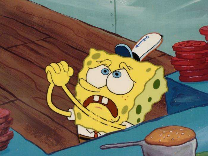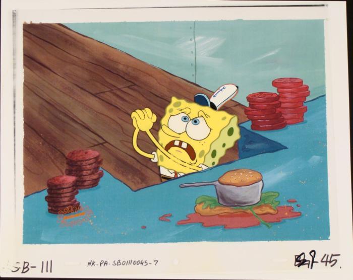 This animation cel and reproduction background are from the Nickelodeon TV show SpongeBob Squarepants. The story takes place under the deep blue sea in Bikini Bottom, where SpongeBob resides. SpongeBob, who is a yellow, porous sponge, is your typical happy-go-lucky character, as he is always cheerful and enjoys making people laugh. Patrick Star, SpongeBob's neighbor who is a starfish, is your average children's show idiot, as he boasts knowing nothing and is often getting himself into ridiculous situations. Between the homes of these two lies the home of the miserable Squidward, a squid, who is known for being grouchy and playing tricks on SpongeBob and Patrick. Both SpongeBob and Squidward work at the Krusty Krab, a fast food business run by the greedy money-loving Mr. Krabs, a crab, the arch rival of the evil, possibly misunderstood, Plankton. Another neighbor, Sandy Cheeks, an athletic squirrel who normally wears an astronaut's space suit, was introduced in "Tea at the Treedome." She spends most of her time inventing and experimenting. Spongebob appears to be pleading his case for whatever he has done...Original Printed Background and Animated Cel Overall Size of Background: 11" x 13 1/2" Overall Size of the Cel: 10 1/2" x 12 1/2" Very good condition This is an original hand-painted cel set-up used in the production of an episode of "SpongeBob SquarePants." Each one-of-a-kind set-up represents a slight change in position of the characters. When individually photographed and projected in rapid succession, the images appear to move.