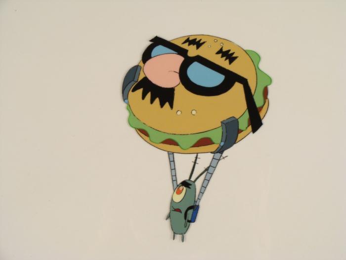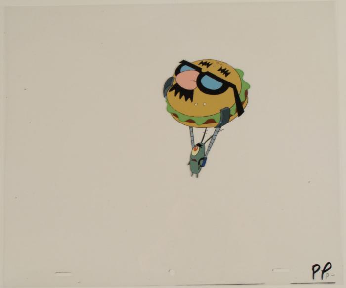 This original animation cel is from the Nickelodeon TV show SpongeBob Squarepants. The story takes place under the deep blue sea in Bikini Bottom, where SpongeBob resides. SpongeBob, who is a yellow, porous sponge, is your typical happy-go-lucky character, as he is always cheerful and enjoys making people laugh. Patrick Star, SpongeBob's neighbor who is a starfish, is your average children's show idiot, as he boasts knowing nothing and is often getting himself into ridiculous situations. Between the homes of these two lies the home of the miserable Squidward, a squid, who is known for being grouchy and playing tricks on SpongeBob and Patrick. Both SpongeBob and Squidward work at the Krusty Krab, a fast food business run by the greedy money-loving Mr. Krabs, a crab, the arch rival of the evil, possibly misunderstood, Plankton. Another neighbor, Sandy Cheeks, an athletic squirrel who normally wears an astronaut's space suit, was introduced in "Tea at the Treedome." She spends most of her time inventing and experimenting. No one will ever know that Plankton stole the Krabby Patty; the perfect getaway. Original Production Animated Cel Overall Size of Cel: 10 1/2" x 12 1/2" Excellent ConditionThis is an original hand-painted cel set-up used in the production of an episode of "SpongeBob SquarePants." Each one-of-a-kind set-up represents a slight change in position of the characters. When individually photographed and projected in rapid succession, the images appear to move.