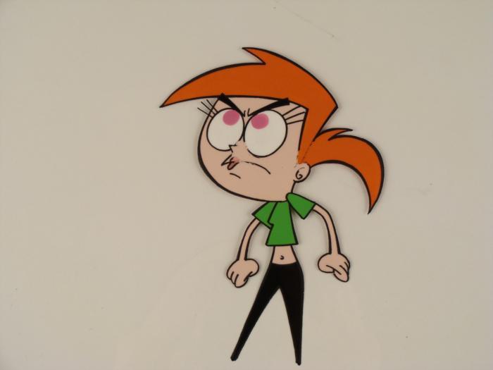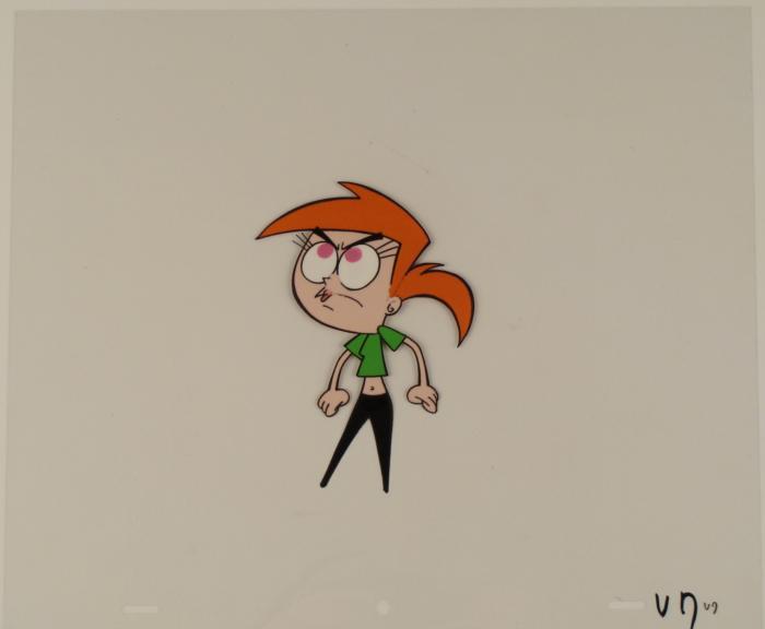 This original animation cel is from the Nickelodeon TV show Fairly Odd Parents. Timmy Turner is a short, buck-toothed 10-year-old boy with a pink cap who lives in Dimmsdale, a small suburban town with his dim-witted parents. His life is constantly miserable, due to the fact that his parents are rarely home and he is babysat by an incredibly evil teenager, Vicky, and that, generally, no one understands him (as indicated by the show's theme song). But everything changes when he receives two fairy parents: Cosmo and his wife, Wanda and later, their son Poof. Timmy learns that his fairy godparents are capable of granting him any wish he wants within certain limits. However, Timmy's immature nature causes him to sometimes ask for wishes that unintentionally result in disaster, and he and his fairy parents and fairy brother must find a way to "unwish" the wish. It looks like Vicky is about to blow a fuse.Original Production Animated Cel Overall Size of Cel: 10 1/2" x 12 1/2" Excellent ConditionThis is an original hand-painted cel set-up used in the production of an episode of "Fairly Odd Parents." Each one-of-a-kind set-up represents a slight change in position of the characters. When individually photographed and projected in rapid succession, the images appear to move.