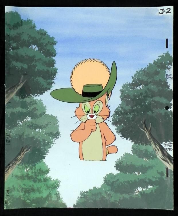 A French folk tale about a cat who, to save his life, promises to transform the poor son of a miller into a noble prince. * * * * Let me see, what is my next plan of attack?? * * * Original Production Background and Animated Cel Overall Size of Background: 10 1/2" x 12 1/2" Overall Size of the Cel: 10 1/2" x 12 1/2" Excellent Condition * * * This is an original hand-painted cel set-up used in the production of an episode of "Puss in Boots." Each one-of-a-kind set-up represents a slight change in position of the characters. When individually photographed and projected in rapid succession, the * images appear to move. * * To create production cels, the original animator's drawing is transferred onto an acetate cel (by hand-inking and/or photo copying). The cel is then hand-painted on the reverse side. The background accompanying this set-up is a hand-painted original production * background. * * The background and cel are ready to be matted and framed. It is a colored background with a cel and has the animator's notations on the left side of the cel and the right side of the background. * *