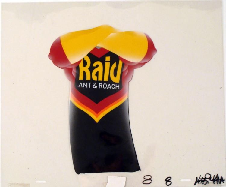 Raid Ant has been a family owned company since 1886 and been killing bugs ever since then. Offered here is a original production cel and matching drawing from the Raid Ant Commercial. * * * * * Raid Ant - this stuff is the real deal... * * * Original Animated Cel * * Overall size: 10 1/2" x 12 1/2" * * Excellent Condition * This is an original hand-painted cel set-up was used in the production of the Raid Ant Commercial. Each one-of-a-kind cel represents a slight change in position of the characters. When individually photographed and projected in rapid succession, the images * appear to move. * * To create production cels, the original animator's drawing is transferred onto an acetate cel (by hand-inking and/or photo copying). The cel is then hand-painted on the reverse side. * * * The cel and drawing are ready to be matted and framed. The animator's notations are at the top and bottom of the drawing and the bottom of the cel *