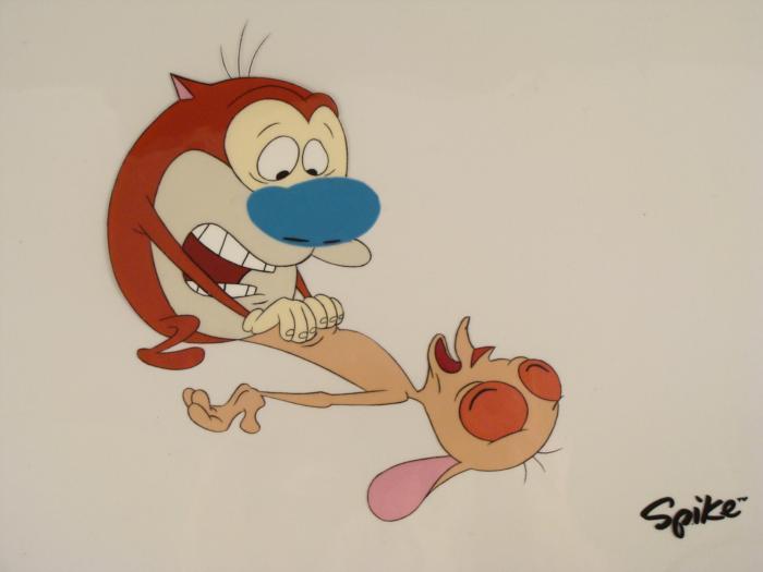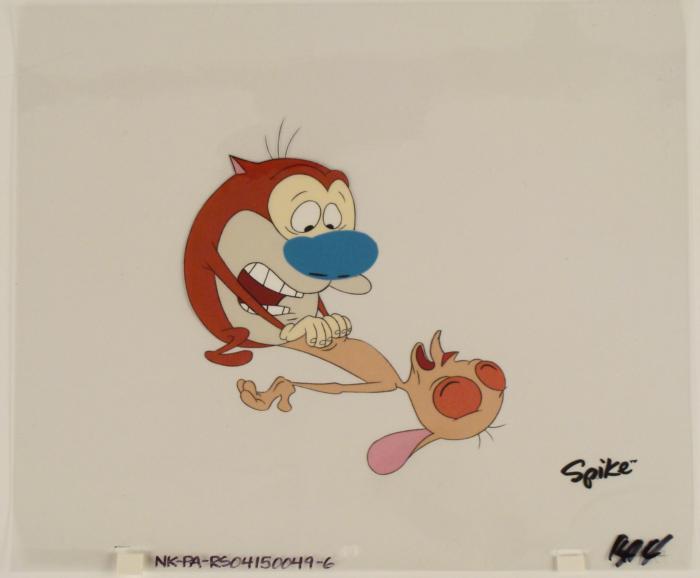 To create production cels, the original animator's drawing is transferred onto an acetate cel (by hand-inking and/or photo copying). The cel is then hand-painted on the reverse side. The cel is ready to be matted and framed. The animator's notations are shown at the bottom of the cel. The cel has multi-layers; first is Stimpy's mouth, followed by both Ren and Stimpy. The Spike TV logo is shown on the bottom right hand corner of the second cel.