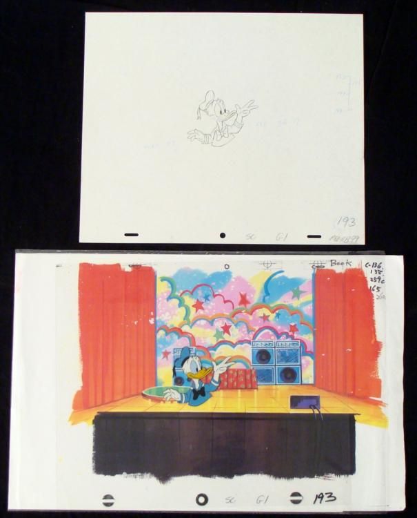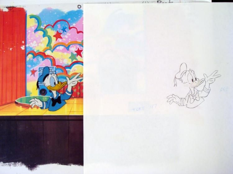 Donald Duck is a cartoon character created in 1934 at Walt Disney Productions. Donald is an anthropomorphic white duck with a yellow-orange bill, legs, and feet. He typically wears a sailor suit with a cap and a black or red bow tie. Donald is most famous * for his semi-intelligible speech and his mischievous and irritable personality. Along with his friend Mickey Mouse, Donald is one of the most popular Disney characters and was included in TV Guide's list of the 50 greatest cartoon characters of all time in * 2002. * * * * Rock out man, rock out!! * * * * The background that accompanies this cel doesn't correspond to the episode the cel is from. However, the cel does come with a matching drawing overlay. * * * Original Drawing, Printed Background, and Animated Cel * Overall Size of Background: 11" x 17" * * Overall Size of the Cel: 10 1/2" x 12 1/2" * Original "rough" animation drawing, in black and non-photo blue pencil, with notations in black and non-photo blue. * Overall Size of Drawing: 10 1/2" x 12 1/2" Very Good Condition * * * This is an original hand-painted cel set-up used in the production of an episode of "Donald Duck." Each one-of-a-kind set-up represents a slight change in position of the characters. When individually photographed and projected in rapid succession, the images * appear to move. * * To create production cels, the original animator's drawing is transferred onto an acetate cel (by hand-inking and/or photo copying). The cel is then hand-painted on the reverse side. The background accompanying this set-up is a reproduction background. * * * The background, drawing, and cel are ready to be matted and framed. The animators notations are located at the bottom of the cel, top of the background, and the top and bottom of the drawing. Part of Donald's beak appears to have been removed with tape and * the right side of the background has slight creasing. *