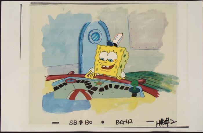This animation cel and reproduction background are from the Nickelodeon TV show SpongeBob Squarepants. The story takes place under the deep blue sea in Bikini Bottom, where SpongeBob resides. SpongeBob, who is a yellow, porous sponge, is your typical happy-go-lucky character, as he is always cheerful and enjoys making people laugh. Patrick Star, SpongeBob's neighbor who is a starfish, is your average children's show idiot, as he boasts knowing nothing and is often getting himself into ridiculous situations. Between the homes of these two lies the home of the miserable Squidward, a squid, who is known for being grouchy and playing tricks on SpongeBob and Patrick. Both SpongeBob and Squidward work at the Krusty Krab, a fast food business run by the greedy money-loving Mr. Krabs, a crab, the arch rival of the evil, possibly misunderstood, Plankton. Another neighbor, Sandy Cheeks, an athletic squirrel who normally wears an astronaut's space suit, was introduced in "Tea at the Treedome." She spends most of her time inventing and experimenting. SpongeBob appears to be in the Krusty Krab.Original Printed Background and Animated Cel Overall Size of Background: 11" x 17" Overall Size of the Cel: 10 1/2" x 12 1/2" Very good condition; it has been storedThis is an original hand-painted cel set-up used in the production of an episode of "SpongeBob SquarePants." Each one-of-a-kind set-up represents a slight change in position of the characters. When individually photographed and projected in rapid succession, the images appear to move.