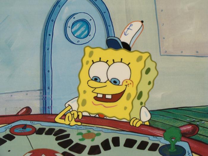 This animation cel and reproduction background are from the Nickelodeon TV show SpongeBob Squarepants. The story takes place under the deep blue sea in Bikini Bottom, where SpongeBob resides. SpongeBob, who is a yellow, porous sponge, is your typical happy-go-lucky character, as he is always cheerful and enjoys making people laugh. Patrick Star, SpongeBob's neighbor who is a starfish, is your average children's show idiot, as he boasts knowing nothing and is often getting himself into ridiculous situations. Between the homes of these two lies the home of the miserable Squidward, a squid, who is known for being grouchy and playing tricks on SpongeBob and Patrick. Both SpongeBob and Squidward work at the Krusty Krab, a fast food business run by the greedy money-loving Mr. Krabs, a crab, the arch rival of the evil, possibly misunderstood, Plankton. Another neighbor, Sandy Cheeks, an athletic squirrel who normally wears an astronaut's space suit, was introduced in "Tea at the Treedome." She spends most of her time inventing and experimenting. SpongeBob appears to be in the Krusty Krab.Original Printed Background and Animated Cel Overall Size of Background: 11" x 17" Overall Size of the Cel: 10 1/2" x 12 1/2" Very good condition; it has been storedThis is an original hand-painted cel set-up used in the production of an episode of "SpongeBob SquarePants." Each one-of-a-kind set-up represents a slight change in position of the characters. When individually photographed and projected in rapid succession, the images appear to move.