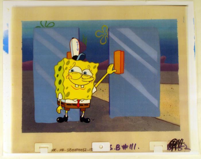 This animation cel and reproduction background are from the Nickelodeon TV show SpongeBob Squarepants. The story takes place under the deep blue sea in Bikini Bottom, where SpongeBob resides. SpongeBob, who is a yellow, porous sponge, is your typical happy-go-lucky character, as he is always cheerful and enjoys making people laugh. Patrick Star, SpongeBob's neighbor who is a starfish, is your average children's show idiot, as he boasts knowing nothing and is often getting himself into ridiculous situations. Between the homes of these two lies the home of the miserable Squidward, a squid, who is known for being grouchy and playing tricks on SpongeBob and Patrick. Both SpongeBob and Squidward work at the Krusty Krab, a fast food business run by the greedy money-loving Mr. Krabs, a crab, the arch rival of the evil, possibly misunderstood, Plankton. Another neighbor, Sandy Cheeks, an athletic squirrel who normally wears an astronaut's space suit, was introduced in "Tea at the Treedome." She spends most of her time inventing and experimenting. It looks like Spongebob is trying to make an escape. Will he do it time before he gets caught?Original Printed Background and Animated Cel Overall Size of Background: 11" x 13 1/2" Overall Size of the Cel: 10 1/2" x 12 1/2" Very good condition This is an original hand-painted cel set-up used in the production of an episode of "SpongeBob SquarePants." Each one-of-a-kind set-up represents a slight change in position of the characters. When individually photographed and projected in rapid succession, the images appear to move.