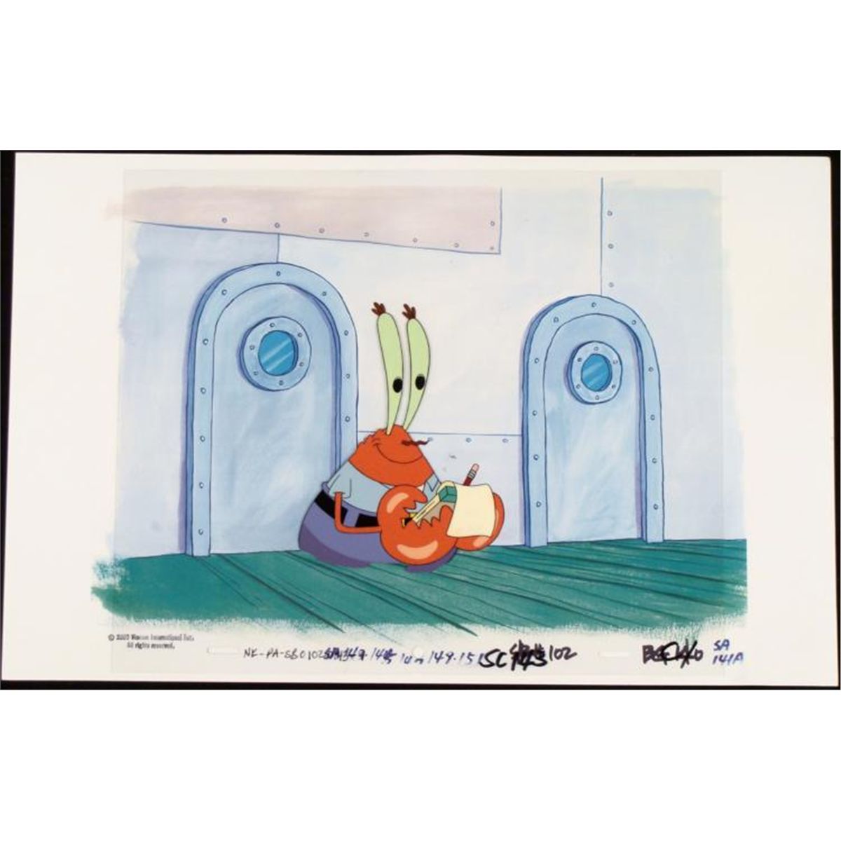* This animation cel and reproduction background are from the Nickelodeon TV show SpongeBob Squarepants. The story takes place under the deepblue sea in Bikini Bottom, where SpongeBob resides. SpongeBob, who is ayellow, porous sponge, is your typical happy-go-lucky character, as he is always cheerful and enjoys making people laugh. Patrick Star, SpongeBob's neighbor who is a starfish, is your average children's show idiot, as he boasts knowing nothing and is often getting himself into ridiculous situations.Between the homes of these two lies the home of the miserable Squidward, a squid, who is known for being grouchy and playing tricks on SpongeBob and Patrick. Both SpongeBob and Squidward work at the Krusty Krab, a fast food business run by the greedy money-loving Mr. Krabs, a crab, the arch rival of the evil, possibly misunderstood, Plankton. Another neighbor, Sandy Cheeks, an athletic squirrel who normally wears an astronaut's space suit, was introduced in "Tea at the Treedome." She spends most of her time inventing and experimenting. * * And how would you like your Krabby Patty cooked?? * * Original Printed Background and Animated Cel Overall Size of Background: 11" x 17" Overall Size of the Cel: 10 1/2" x 12 1/2" Excellent condition This is an original hand-painted cel set-up used in the production of an episode of "SpongeBob SquarePants," titled Squeaky Boots. Each one-of-a-kind set-up represents a slight change in position of the characters. When individually photographed and projected in rapid succession, the images appear to move. * To create production cels, the original animator's drawing is transferred ont oan acetate cel (by hand-inking and/or photo copying). The cel is then hand-painted on the reverse side. The background accompanying this set-up is a reproduction background. * * * The printed background and cel are ready to be matted and framed. The notations are located at the bottom of both. *