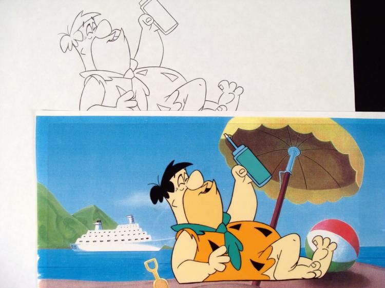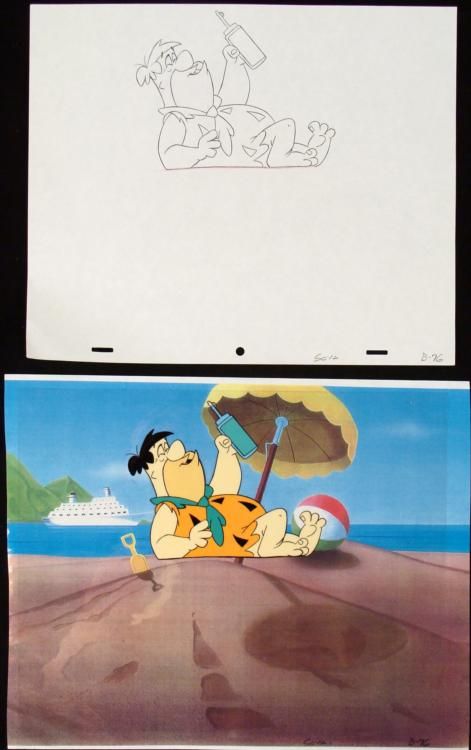 The show is set in the Stone Age town of Bedrock. (In some of the earlier episodes, it was also referred to as "Rockville"). The Flintstones was about a working-class Stone Age man's life with his family and his next-door neighbor and best friend. The show's * continuing popularity rested heavily on its juxtaposition of modern everyday concerns in the Stone Age setting. In this fantasy version of the past, dinosaurs, saber-toothed tigers, woolly mammoths, and other long-extinct animals co-exist with cavemen. Like * their mid-20th century peers, these cavemen listen to records, live in split-level homes, and eat out at restaurants, yet their technology is made entirely from pre-industrial materials and largely powered through the use of various animals. For example, the * cars are made out of stone, wood, and animal skins, and powered by the passengers' feet. * * * Man, this is the life... A life without worry and responsibility, how can anything go possibly wrong?? * * * * * Original Animation Cel, Drawing, and Reproduction Background * * Original "rough" animation drawing, in black pencil with the notations in black * * Overall size is a 12-field drawing that is 10 1/2" × 12 1/2" * Overall Size of Cel: 10 1/2" x 12 1/2"Overall Size of Background: 11" x 13 1/2" * * Very Good condition; been stored * * * * * This is an original hand-painted cel set-up used in the production of an episode of "The Flintstones." Each one-of-a-kind set-up represents a slight change in position of the characters. When individually photographed and projected in rapid succession, the * images appear to move. * * To create production cels, the original animator's drawing is transferred onto an acetate cel (by hand-inking and/or photo copying). The cel is then hand-painted on the reverse side. The background accompanying this set-up is a reproduction background. * * * * * The cel and drawing received by the winning bidder may be ever so slightly different from that in the auction photo. * * * * The printed background, drawing, and cel are ready to be matted and framed. The notations are located at the bottom of the drawing and cel. * * *