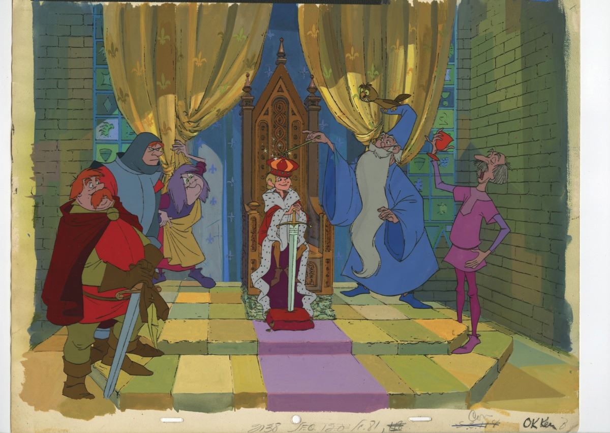 (Walt Disney Studios, 1963) Stunning original production background with painted overlay cel. The background, seen at the finale of the feature, comes with a special overlay cel , painted at the studio and featuring all the main characters from the film. The setup was put together for publicity purposes,and most likely featured in promotional materials. The entire piece measures 10.5"x12.5". In fine condition.