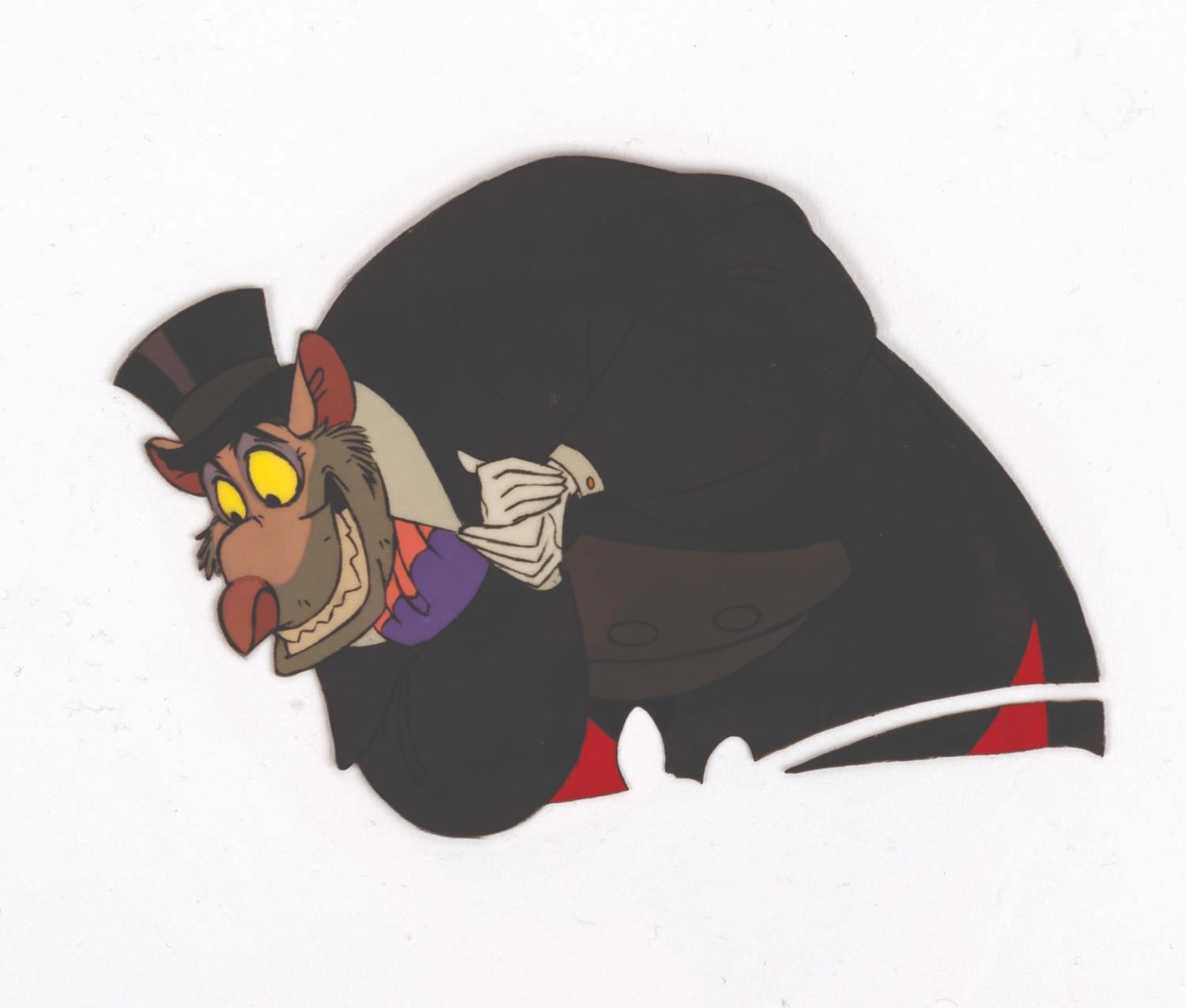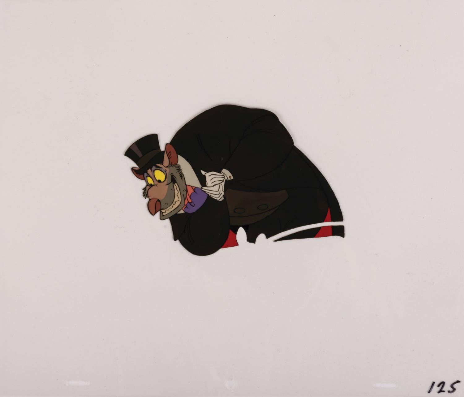 (Disney,1986) An original production cel of the villainous Ratigan from Disney's 1986 animated feature film, The Great Mouse Detective. Ratigan's image measures 4"x5.5" on a 10.5"x12.5" untrimmed cel. The condition is very fine.