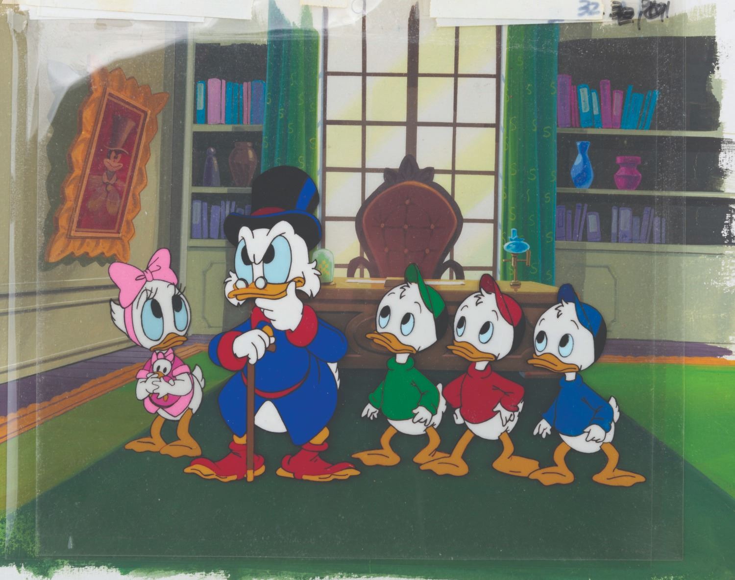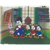 (Disney, 1987) A rare set of 4 production cels paired with a production background from Disney's 1987 TV Series, "DuckTales." The cels and background are from the first season of the popular series. The total image size of the characters is 8"x5" on untrimmed 10.5"x9.5" animation cels. The background measures 14"x10". The cels and background are in fine condition with strong lines and all paint intact.