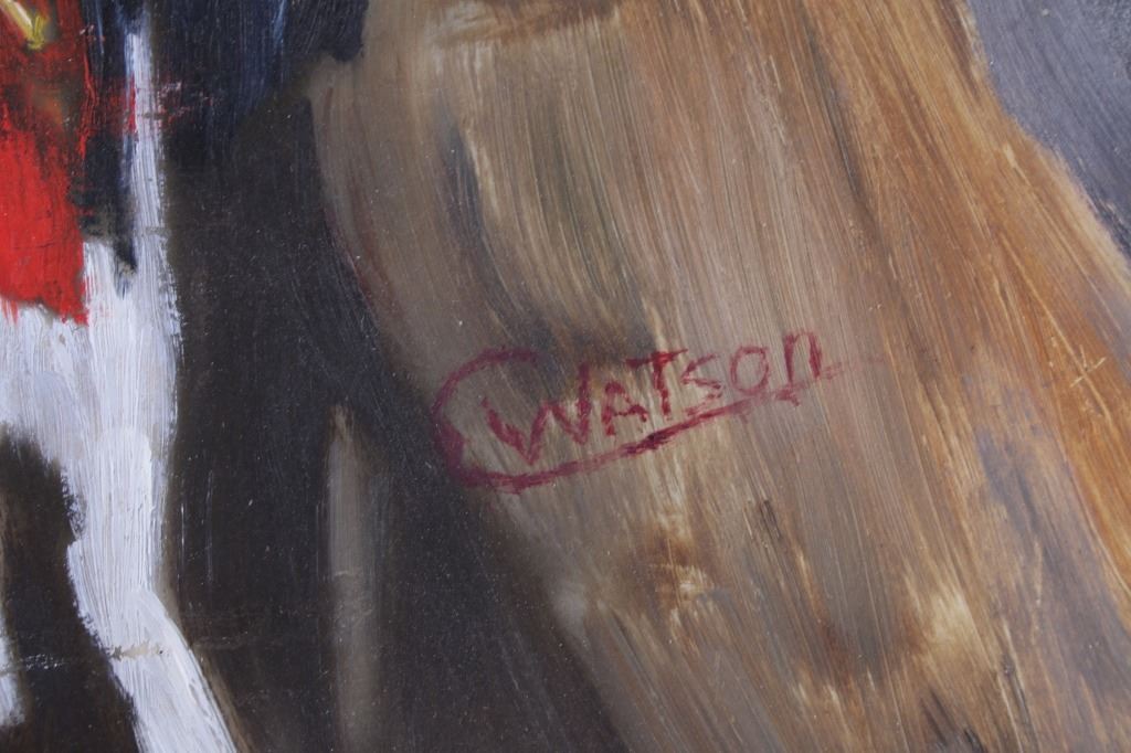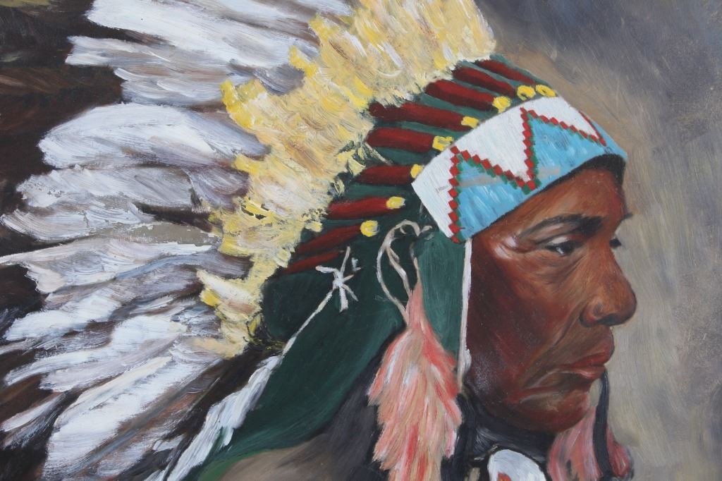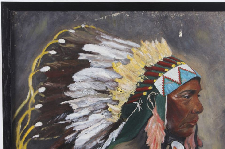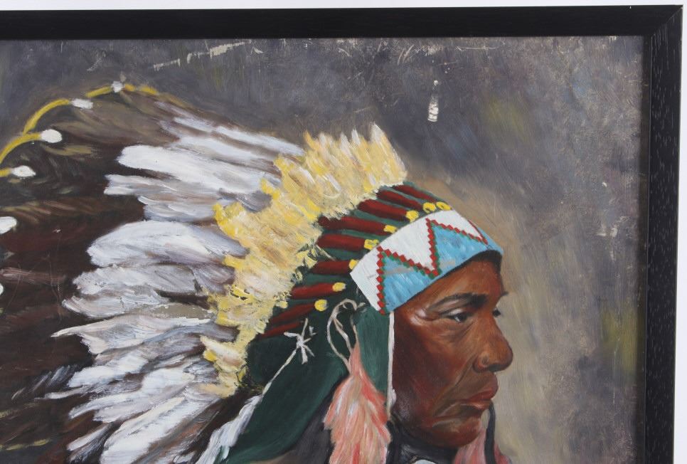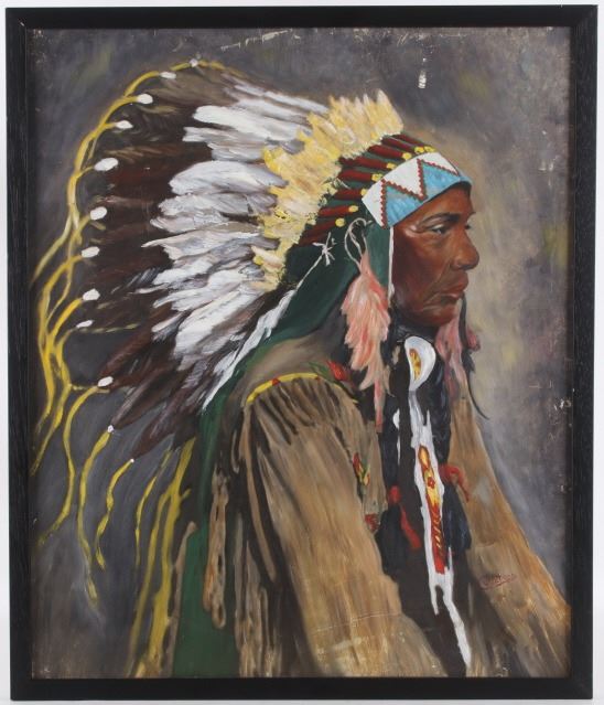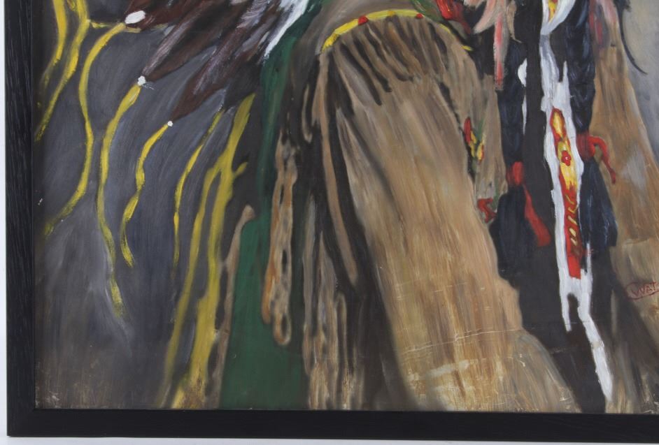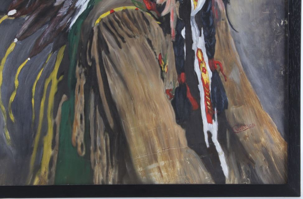 Featured in this lot is this original Ceremonial Native man by Stanbar C. Watson. This is a wonderfully and professionally crafted oil painting of a Native man wearing ceremonial garments and facing to the left. It is signed in the bottom right-hand corner. The condition of this oil-on-board is good, with some slight wear to the painting and no obvious signs of damage to the frame. The measurements of this oil-on-board are 25" x 21 1/4" and the visible art measures 23 1/2" x 19 1/2". Provenance: This is from the personal artist Margie Jackson.